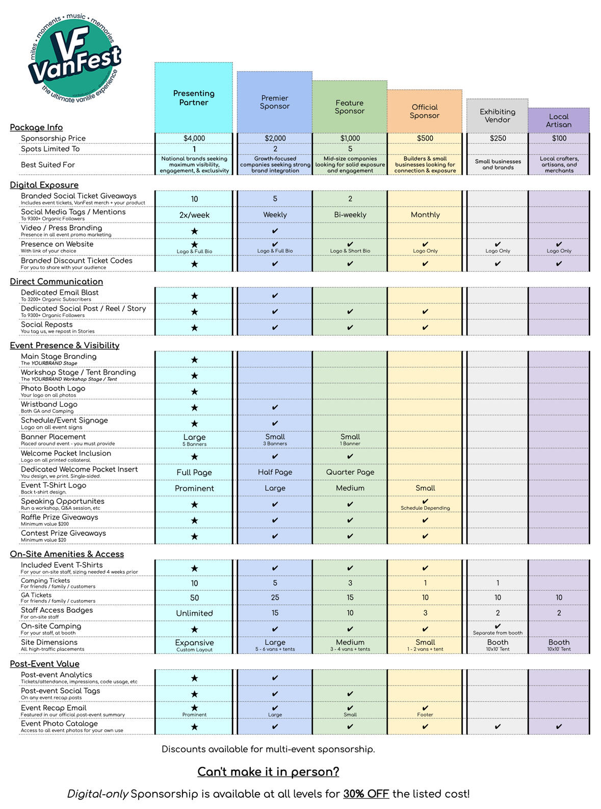 Sponsor & Vendor details vary between events -- use the buttons above to explore packages for the event you're interested in.We offer discounts if you'd like to sponsor multiple events!If you're not able to make it but still want some awesome brand exposure, we offer digital-only sponsorships for 30% off of the listed price.