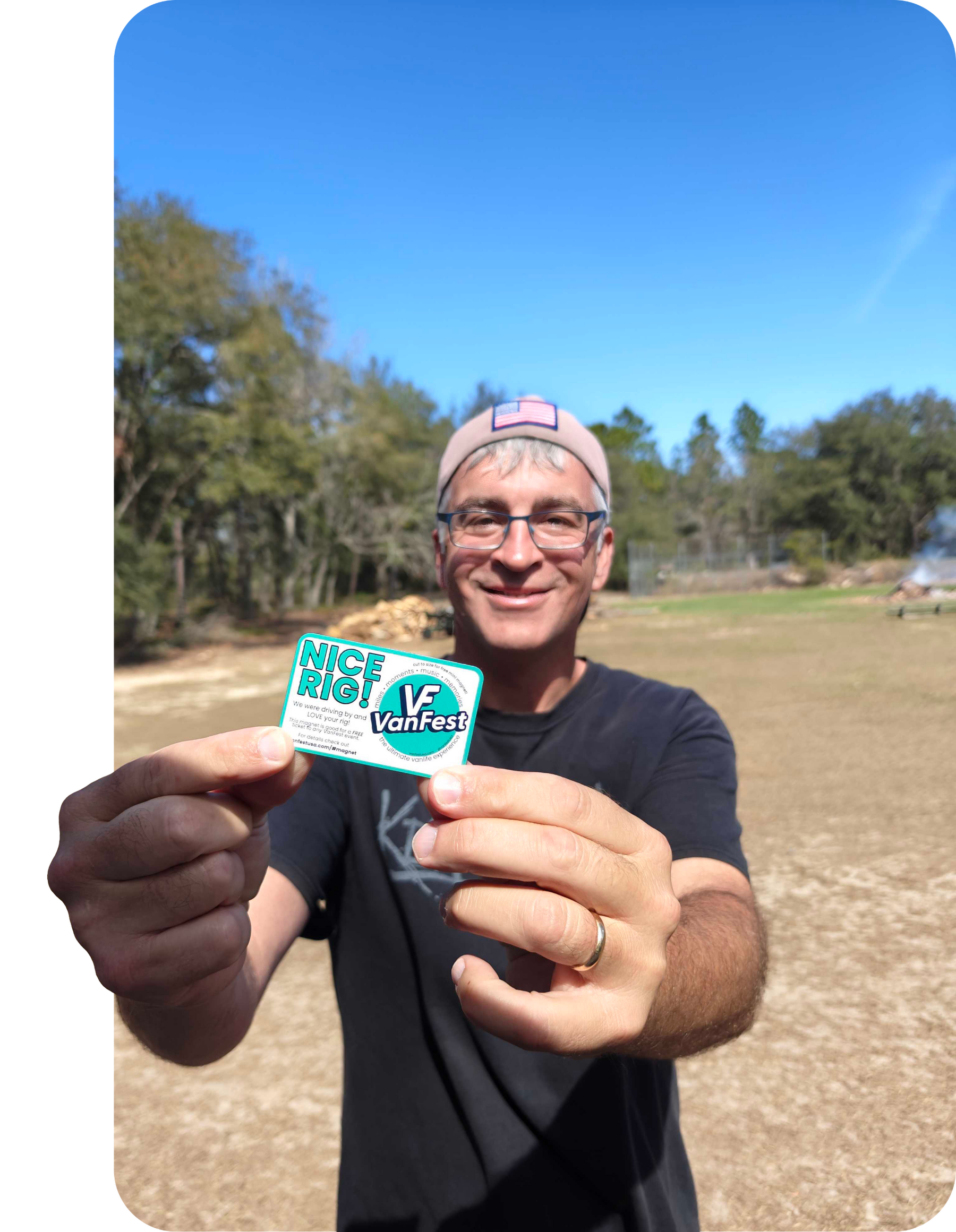 BUT If you'd like a 100% free camping ticket to any VanFest event, then you're in luck!Just throw up a post on your social media channel of choice (we prefer Instagram, but we're also on Facebook) of you with your NICE RIG! magnet. It could be you holding it, on your van, whatever! We are not on Twitter/X or Tiktok.Get creative with it! Just make sure to mention us, like "@vanfestusa loves our van/bus/rig!"